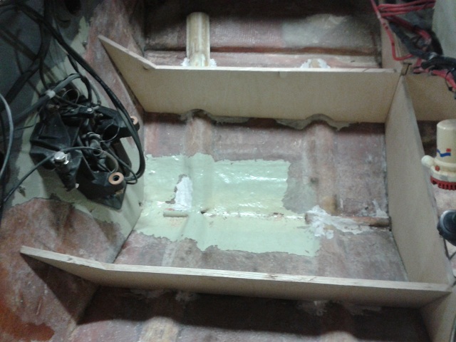 Nyt tehtiin vähän järeämmät eli perälautaa vasten kolmiokorotukset, jolloin kiinnityspinnaksi saatiin n 37cm ja laipioiden paksuutta kasvatettiin lähes kaksinkertaiseksi. Kaikki uusi koivuvaneri lasikuidun sisällä on hartsilla kyllästetty ennen laminointia. Tankkitilan toisella sivulla ollut mätä sivulaipio ei jatkunut onneksi kuin n 40cm eteenpäin, joten sen uusiminen ja kuiduttaminen meni samalla kun konehuoneen lasikuitutyöt tehtiin. Tässä uudet laipiot alkavat olla kuidutettuna paikoillaan...