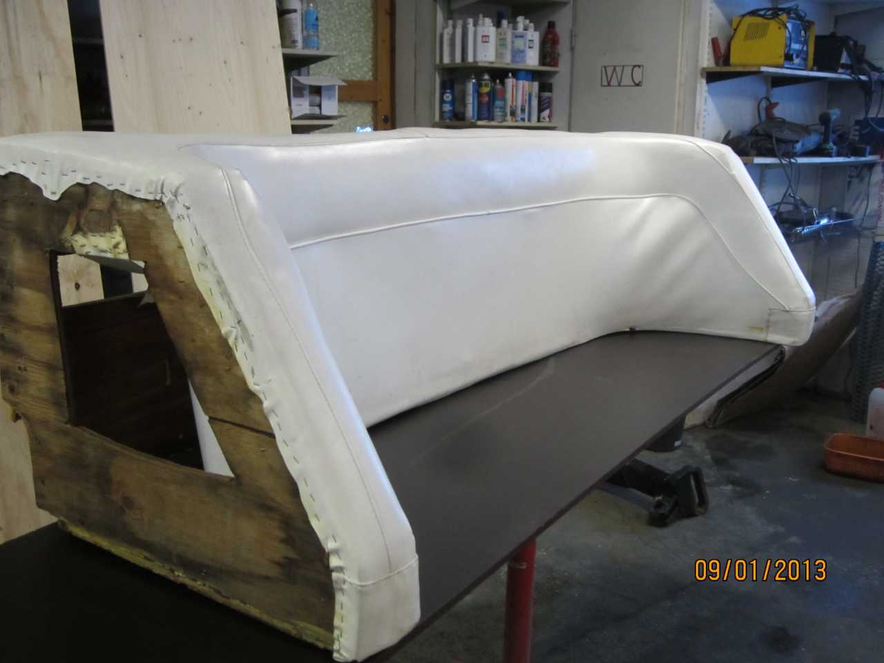 Istuimen runko on täysi kopio alkuperäisestä,ainoastaan paremmat ja kestävämmät materiaalit. Ajattelin että pidän alkuperäisenä ja verhoilutan alkuperäisväriteeman takaisin. Kaikki vanerinpalaset on käsitelty himmeällä venelakalla käyttöiän pidentämiseksi. Saniteettitiloissa käytettävä vesieriste olisi varmaan myös aika kova sana. Takapenkin alempi runko on 33cm, siihen päälle istuinosan runko 18mm ja verhoiltu patja.